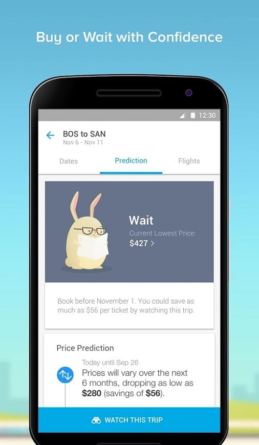 Few things are more frustrating for frugal flyers than booking a plane ticket only to see it discounted days later. That needn’t happen to you with Hopper. The app’s creators say it “analyzes billions of flight prices daily to predict how prices will change.” All the info you need is hidden behind the Prediction tab. Not only does it show you the lowest current price on your selected route, but it also suggests whether you should buy now or later. The app also predicts how much the fare will drop and when you can expect it to start rising. Tap “Watch this Trip” to be alerted when the price falls and before an expected price hike.