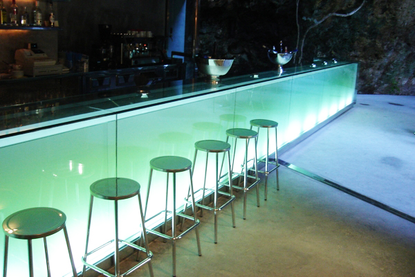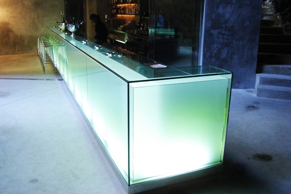The counter made ​​of glass plates backlit which is 15 m wide is the most important element of the project; it has the shape of a parallelepiped and is inserted in a cavity of cement square lines that contrasts with the irregularities of the natural element constituted by caves rock.