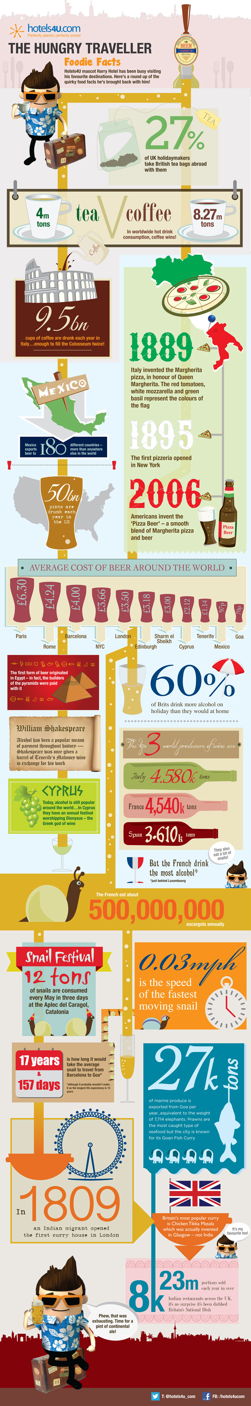 What does beer have to do with William Shakespeare? How long would it take a snail to travel from Barcelona to Goa, and what’s that got to do with curry? Find out the answers to these questions and more in the Hungry Traveller Foodie Facts infographic by Hotels4U.